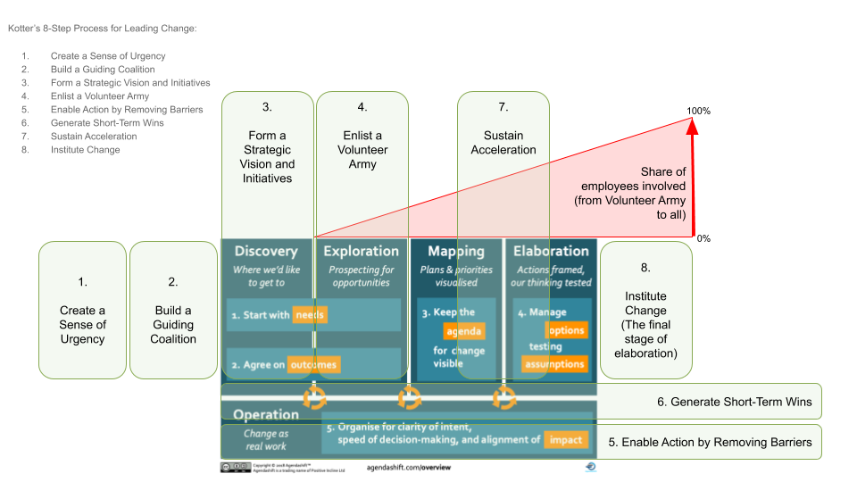 The purpose is to Generate Short-Term Wins, while any blockers will be resolved by the Guiding Coalition. Mapping and Elaboration are catalysts to Sustain Acceleration. While more and more people in the company adopt the change, it’s important to keep the agenda visible. Elaboration of the change is required until finally the Change has been Institutionalized.